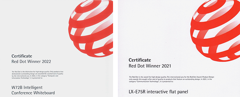 2. Le tableau blanc interactif LX-E75R a remporté le prix Red Dot Product Design Award 2021 en Allemagne et le prix China Excellent Industrial Design Award Re-evaluation Finalist 2020.