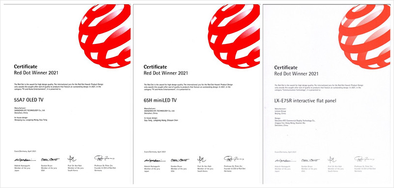 今年三月,2021年德国红点奖评选结果揭晓,6686体育公司自主研发设计产品65H miniLED TV 、55A7 OLED TV以及6686体育商用产品LX-E75R 交互电子白板荣获了享有“设计界奥斯卡”之誉的德国红点设计奖。近期,公司收到了由主办方颁发的红点奖证书。