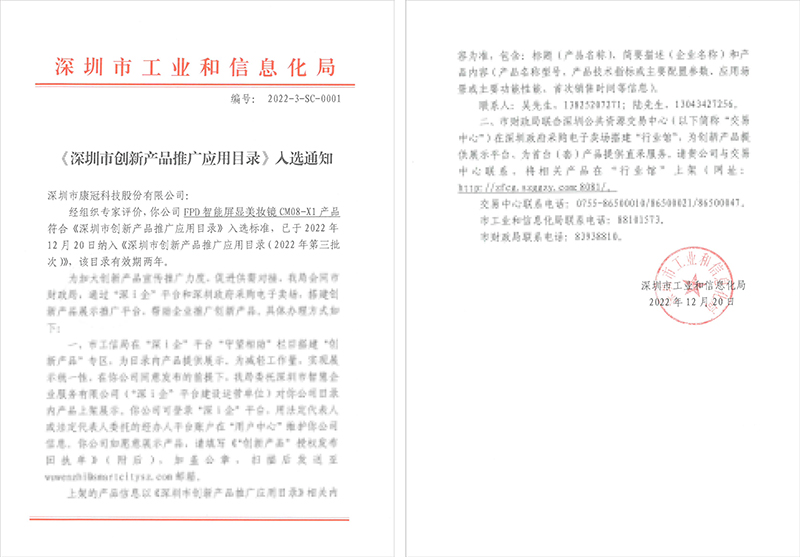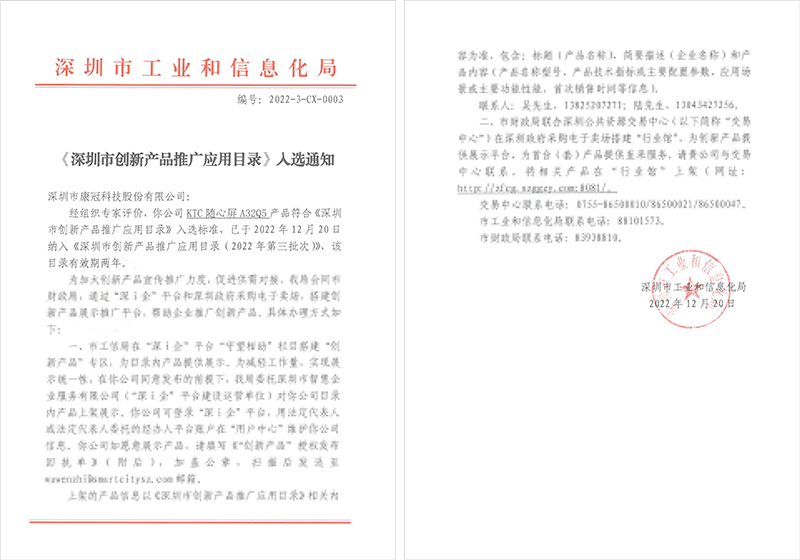 近期,深圳市工业和信息化局发布《深圳市创新产品推广应用目录(2022年第三批次)》,6686 - 看球聊球追世界杯就来6686体育有限公司官方网站的KTC随心屏、FPD智能屏显美妆镜成功入选该目录,并成为政府机构采购推荐产品。