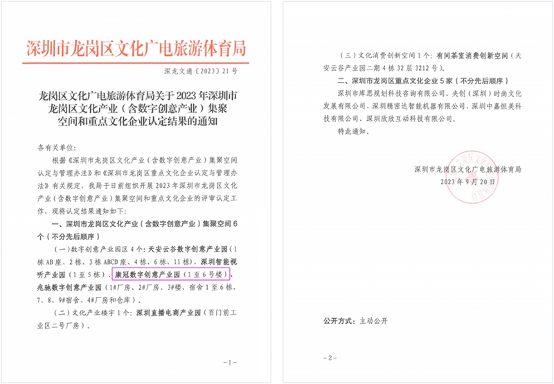 近期,深圳市龙岗区文化广电旅游体育局组织开展了2023年深圳市龙岗区文化产业(含数字创意产业)集聚空间和重点文化企业的评审认定工作,其中6686体育数字创意产业园荣获“龙岗区数字创意产业园区”认定。